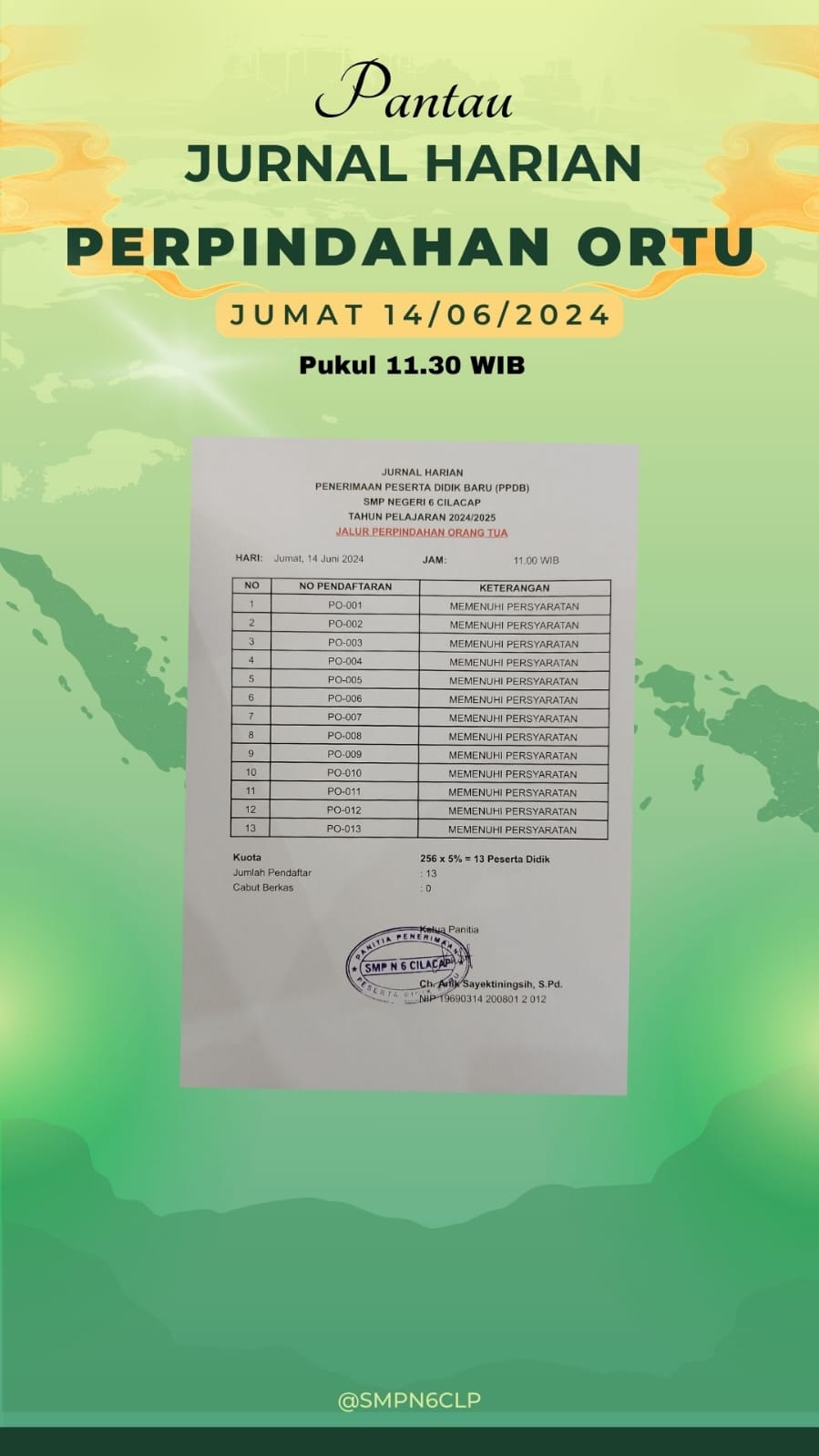 JURNAL PPDB 2024/2025, JUMAT 14 JUNI 2024, JALUR PERPINDAHAN ORANG TUA